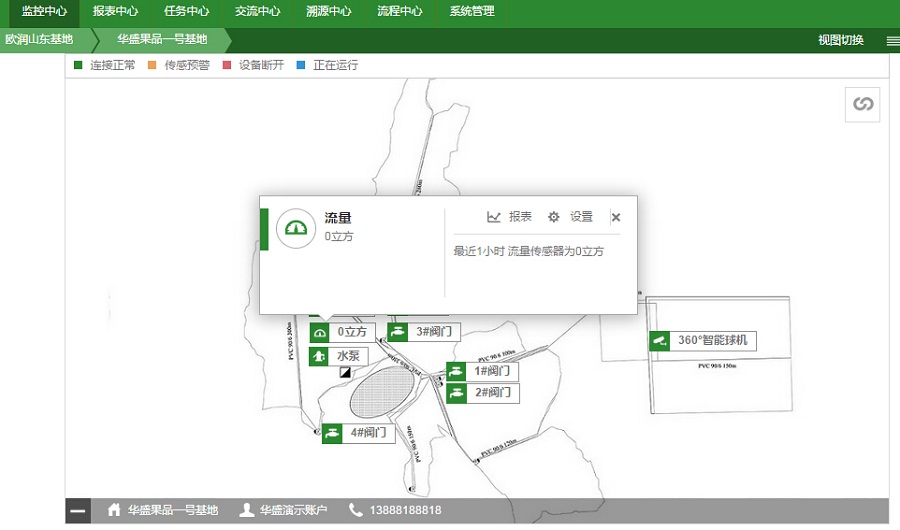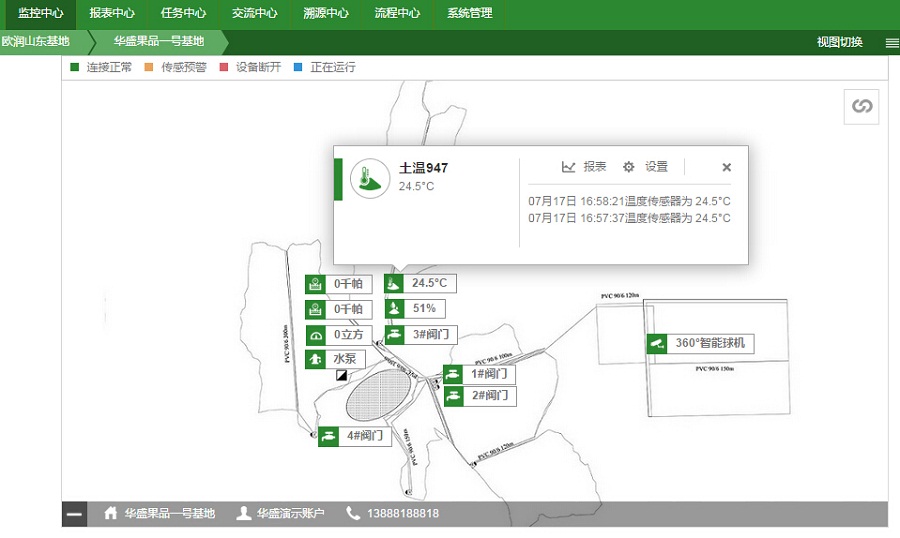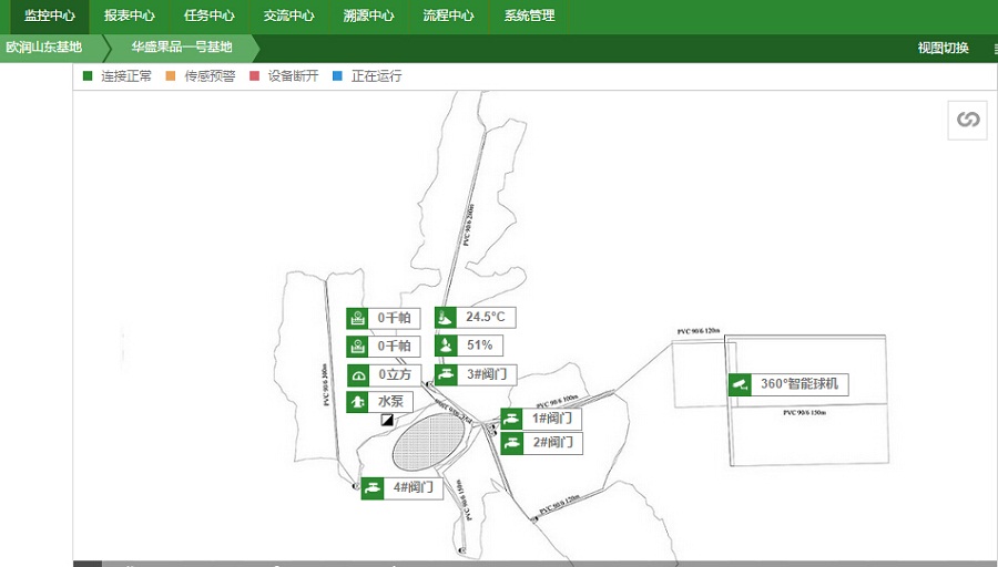 2015年華盛果品引入東山歐潤水肥灌溉一體化系統(tǒng),在園區(qū)全面部署了滴灌系統(tǒng),將園區(qū)規(guī)劃為5個獨立灌溉區(qū)域,可進行獨立灌溉作業(yè)。并借助天潤智力智慧農(nóng)業(yè)云平臺技術,實現(xiàn)全自動化遠程灌溉,徹底結(jié)束傳統(tǒng)人工灌溉模式。為了能夠智能化地進行灌溉作業(yè),天潤智力智慧農(nóng)業(yè)云平臺通過傳感器監(jiān)測土壤溫濕度、360°高清視頻監(jiān)測園區(qū)灌溉情況,以及實時監(jiān)測泵房的水壓流量,讓管理員可以多維度、多角度,綜合多種數(shù)據(jù)對灌溉作業(yè)進行全面分析與掌握。
