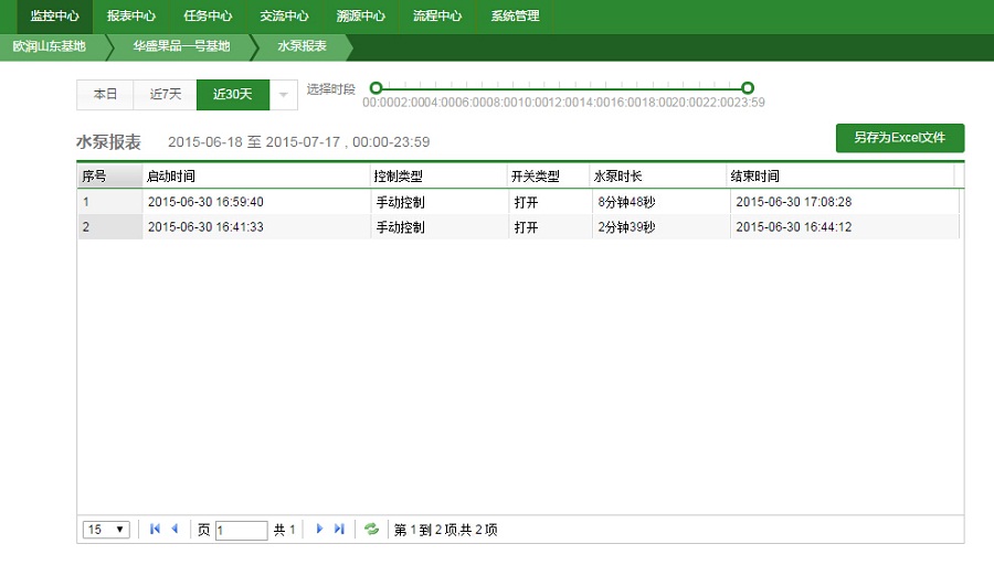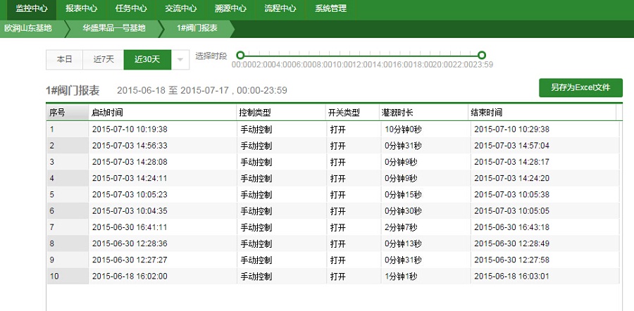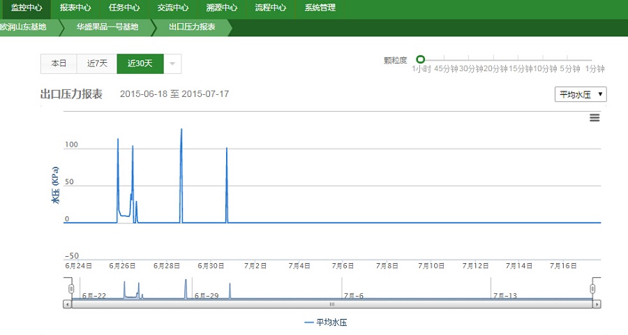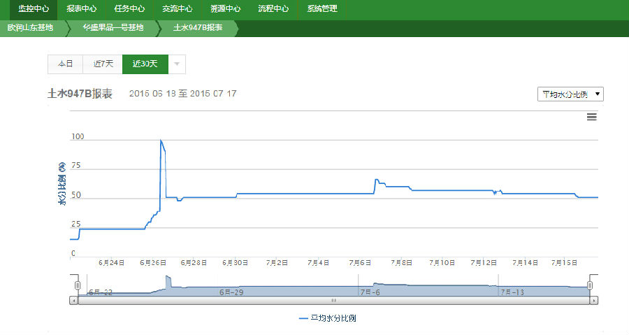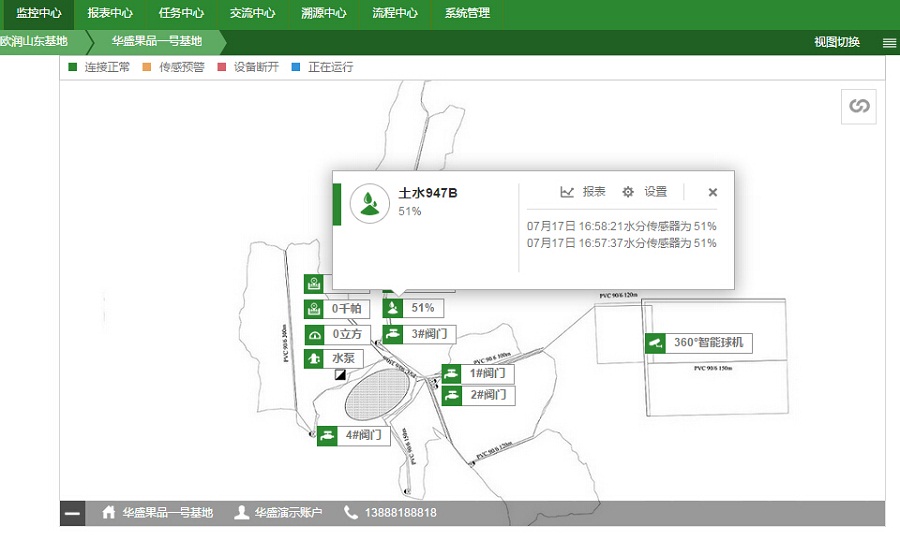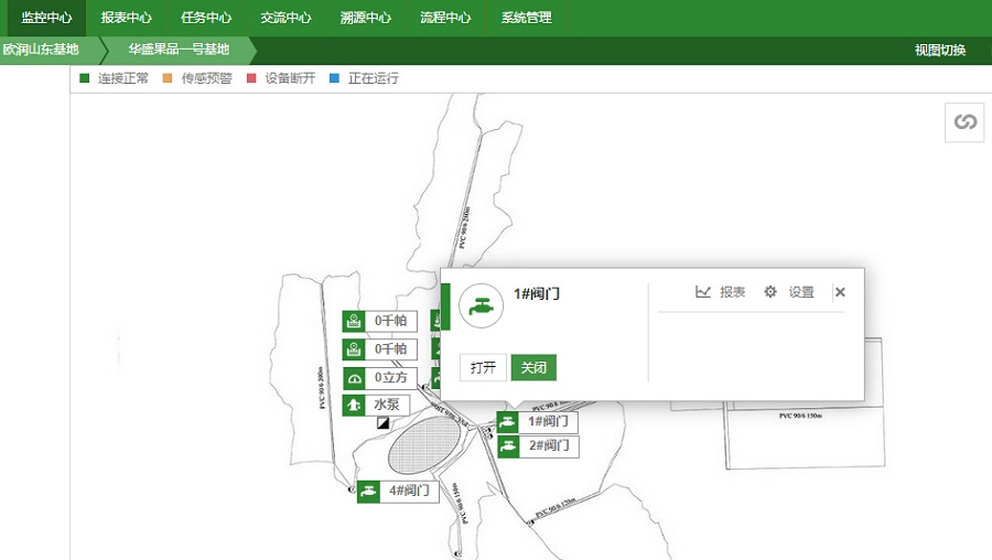 蘋果屬于需水量大的果樹,每年需要大量水分,而我國又是水資源貧乏的國家,尤其是北方地區(qū)水資源嚴重短缺,而且農(nóng)田灌溉用水占整個農(nóng)業(yè)用水的95%,因此應用節(jié)水灌溉技術就顯得十分必要和重要。2015年6月,華盛果品承接山東沂源縣水利部農(nóng)業(yè)水價改革節(jié)水示范項目,引入歐潤的灌溉設備以及天潤智力智慧農(nóng)業(yè)云平臺技術,實現(xiàn)全自動化遠程灌溉,徹底結(jié)束傳統(tǒng)人工灌溉模式。