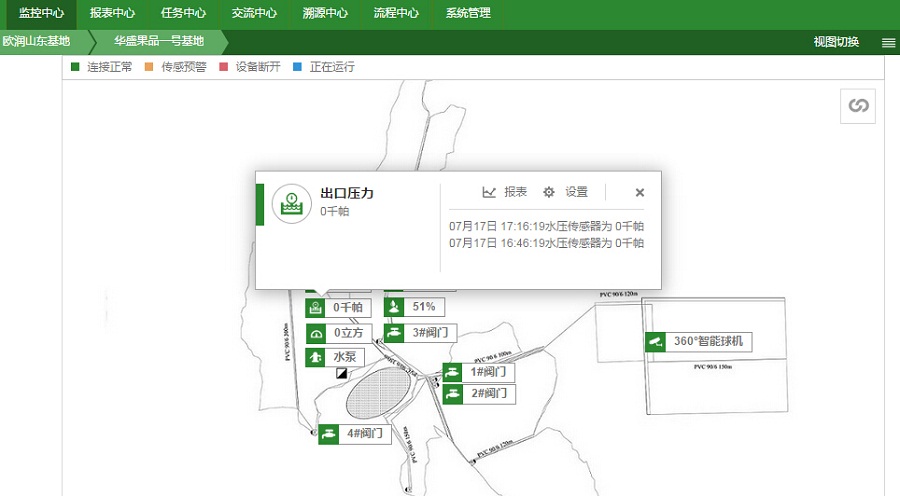 通過在泵房安裝水壓、流量傳感器,管理員可隨時隨地在手機上查看泵房的水壓和流量。因為園區(qū)較大,需要對水壓進行實時監(jiān)測,確保能夠灌溉到園區(qū)的每一個角落。對流量的實時監(jiān)測,則可整體掌握園區(qū)的灌溉用水情況