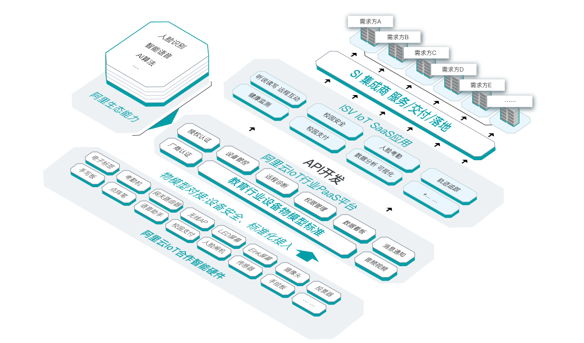 阿里云IoT基礎(chǔ)平臺,支撐校園設(shè)備穩(wěn)定可靠接入,方便IHV跟ISV之間高效對接流轉(zhuǎn),減少管控運維成本。阿里生態(tài)能力支撐ISV應(yīng)用快速低成本形成場景解決方案,服務(wù)學(xué)校、機(jī)構(gòu)、SI等不同需求方。通過Link Market應(yīng)用市場,幫助SI快速找到需要的應(yīng)用。