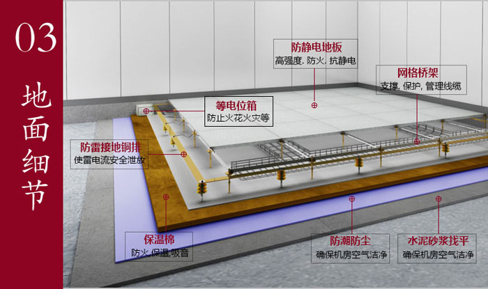( 1)地板采用高強(qiáng)度的抗靜電地板,它拆卸靈活、互換性能好,能提供靜壓風(fēng)庫,抗御靜電荷等優(yōu)點(diǎn),可用于任何管線敷設(shè)集中,防止靜電產(chǎn)生的場(chǎng)所。 防止和消除機(jī)房的靜電積沉,是保證計(jì)算機(jī)安全可靠運(yùn)行和消除操作人員安全心理障礙的主要技術(shù)之一,防靜電活動(dòng)地板是實(shí)現(xiàn)這種技術(shù)的有效設(shè)施。2)因機(jī)房在精密空調(diào)的作用下處于恒溫恒濕的狀態(tài)下,鋪20mmPE防火保溫板有效地防止地板下結(jié)露現(xiàn)象的產(chǎn)生。 3)為防止止機(jī)房內(nèi)精密空調(diào)漏水事故,特要求增設(shè)防水墻一道及地漏,并在其四周鋪設(shè)漏水感應(yīng)設(shè)備能夠及時(shí)的發(fā)現(xiàn)水患的存在并避免水患的擴(kuò)大。)