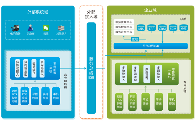 針對電商、合作伙伴、銀行、微信等外部網(wǎng)絡(luò)接入需求,零售信息整合平臺提供基于ESB的統(tǒng)一接入方式,實現(xiàn)外部網(wǎng)絡(luò)域集團內(nèi)部網(wǎng)絡(luò)隔離,最大程度的保障集團內(nèi)部系統(tǒng)安全。