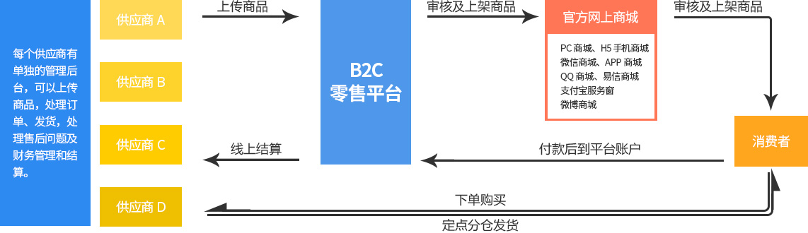 多供應(yīng)商零售電商解決方案,主要是幫助企業(yè)打通上游供應(yīng)鏈,整合已有的資源優(yōu)勢(shì),結(jié)合線上全渠道銷售通道,構(gòu)建一個(gè)智能化的零售商業(yè)生態(tài)圈。0倉儲(chǔ)成本,定點(diǎn)發(fā)貨,是企業(yè)零售運(yùn)營的新模式。