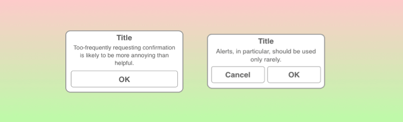 在 iOS 與 macOS 中,有「將表示同意的動作放在右邊,表示不同意的動作放在左邊」的定義,請遵守這個資訊的排列規(guī)則。但注意在 Windows 或者舊版的 Android 中,這個規(guī)則剛好是反過來的。