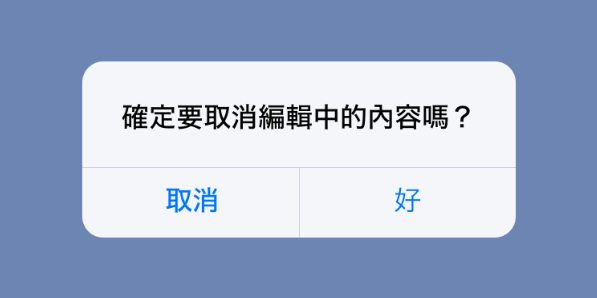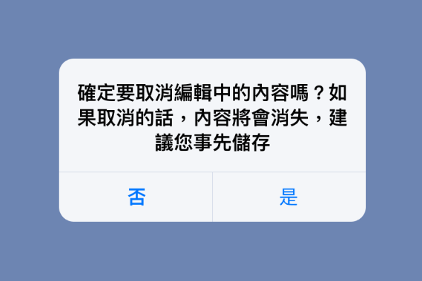 問句確定要取消編輯中的內(nèi)容嗎?確認是否要舍棄編輯中的內(nèi)容(兩個選項)