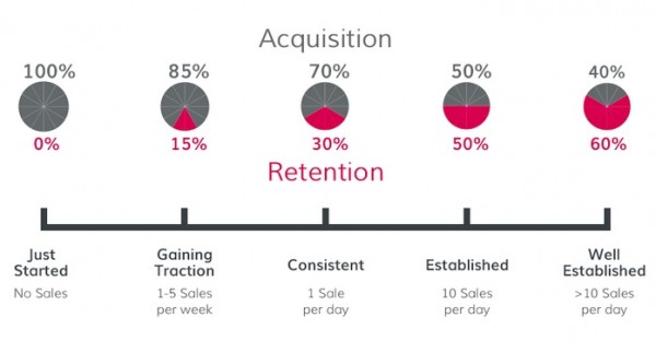 在了解了顧客獲取和留存各自的重要性,我們可以開(kāi)始研究要怎么分配預(yù)算。我們必須讓這件事同時(shí)進(jìn)行,會(huì)變動(dòng)的只有分配在上面的金額。你的分配策略應(yīng)該或由兩個(gè)因素主導(dǎo):商店的生命周期和產(chǎn)品的定位。