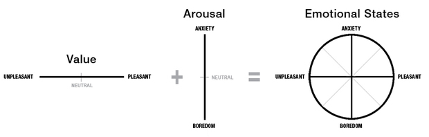 喚醒度是指身體、大腦或特定行為的無意識(shí)激活。人們使用焦慮(anxiety)對(duì)無聊(boredom)的水平來定義它;我們可以通過心跳速率、呼 吸、血壓和皮膚電來測(cè)量它。簡言之,你可以將喚醒度看作是刺激或激活的水平。我們將情緒的兩個(gè)維度(也就是,意識(shí)/認(rèn)知和無意識(shí)/生理)結(jié)合,就得到情緒 的環(huán)狀模型。