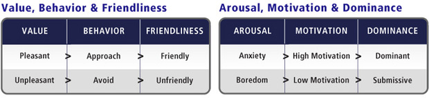情緒的價(jià)值維度能夠影響我們的行為(即,趨近還是回避),而喚醒維度則影響我們做事情的動(dòng)機(jī)。情緒影響行為的不同方面,而隨著時(shí)間的推移人們會(huì)將情緒的表達(dá)知覺為不同的人格方面。價(jià)值影響友好性的知覺,喚醒則影響支配性的知覺。