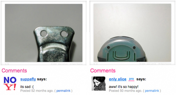 觀察下面的兩個(gè)簡單物體。它們?cè)诒磉_(dá)情緒嗎?作為靜態(tài)的物體,它們表達(dá)的任何情緒都不會(huì)隨著時(shí)間的推移而改變。如果人格的主要維度是友好性和支配 性,你覺得哪個(gè)物體更友好?哪個(gè)更具有支配性?看看人們?cè)谡掌旅媪粝碌脑u(píng)論?鞓放c友好的神態(tài)、愉悅和趨近行為相關(guān),而悲傷則與不友好、痛苦和回避行為 相關(guān)。
