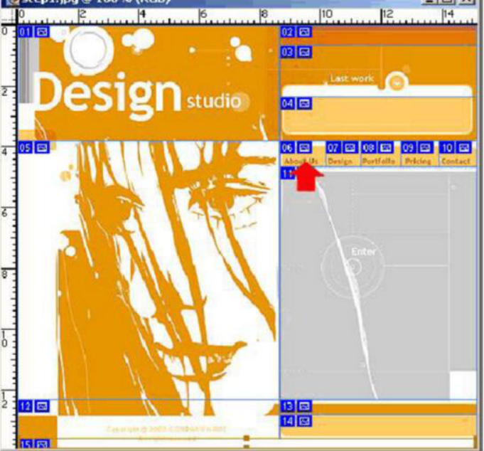 選擇工具板上的slice切片工具,先大刀闊斧的切上一番! 技巧:大面積的色塊單獨(dú)切成一塊,盡可能的保持在水平線上的整齊(這個(gè)問題你們?cè)诤竺娴闹谱黜撁嬷猩钣懈杏|)切好的圖如下所示: