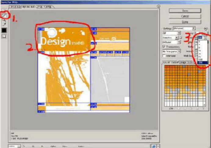 我們來看看紅線所標(biāo)識(shí)的1.2.3部分,將1所示的切片工具選中,然后點(diǎn)選2所示的圖片,在3所示的地方選擇色值,如果色彩單一可以選擇盡量小的色值位;設(shè)置好之后輸出文件,文件里包括htm和image的文件夾。到這里頁面就算完成一半。