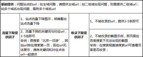 2.站點收錄下降,需要提供單條未被百度收錄的URL,同時附加未被收錄的截圖,一般而言,URL提供3到5條即可。