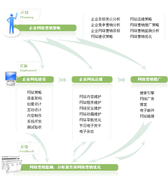 北京網(wǎng)站建設(shè)中心提供全面的企業(yè)網(wǎng)絡(luò)營(yíng)銷(xiāo)解決方案,解決方案的實(shí)施包括三個(gè)階段:計(jì)劃階段、實(shí)施階段、反饋階段。在計(jì)劃階段,我們首先確定客戶企業(yè)網(wǎng)絡(luò)營(yíng)銷(xiāo)目標(biāo),通過(guò)對(duì)客戶目標(biāo)受眾和競(jìng)爭(zhēng)對(duì)手營(yíng)銷(xiāo)調(diào)研分析,制定出適合客戶的網(wǎng)絡(luò)營(yíng)銷(xiāo)實(shí)施策略。網(wǎng)絡(luò)營(yíng)銷(xiāo)實(shí)施策略不僅僅包括網(wǎng)站建設(shè)策略,還包括網(wǎng)站的運(yùn)維策略、網(wǎng)絡(luò)營(yíng)銷(xiāo)推廣策略、網(wǎng)絡(luò)營(yíng)銷(xiāo)監(jiān)測(cè)分析、網(wǎng)絡(luò)營(yíng)銷(xiāo)優(yōu)化等。在實(shí)施階段,我們會(huì)根據(jù)制定好的網(wǎng)路營(yíng)銷(xiāo)實(shí)施策略進(jìn)行網(wǎng)站建設(shè)、網(wǎng)站運(yùn)維以及網(wǎng)絡(luò)營(yíng)銷(xiāo)推廣。反饋階段與實(shí)施階段是同時(shí)進(jìn)行的,在網(wǎng)站建設(shè)、網(wǎng)站運(yùn)維和網(wǎng)絡(luò)營(yíng)銷(xiāo)推廣過(guò)程中,我們會(huì)根據(jù)網(wǎng)絡(luò)營(yíng)銷(xiāo)監(jiān)測(cè)系統(tǒng)搜集的數(shù)據(jù)進(jìn)行詳細(xì)的分析,為客戶提供網(wǎng)絡(luò)營(yíng)銷(xiāo)監(jiān)測(cè)分析報(bào)告,并提供可行性的網(wǎng)絡(luò)營(yíng)銷(xiāo)策略優(yōu)化建議。