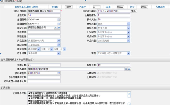 行程制作:制作散團(tuán)行程,細(xì)化到酒店、車、餐、導(dǎo)游、景點(diǎn)、節(jié)目、購物等